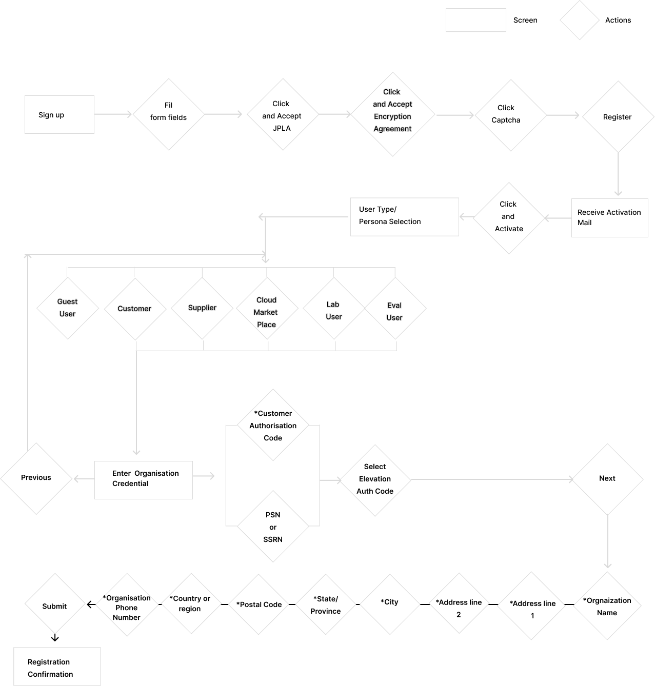 5 steps with redundant details and no clear feedback.Email validation > Enter organisation details (9 fields) > Select User Type > Read and approve Encryption > Confirmation
